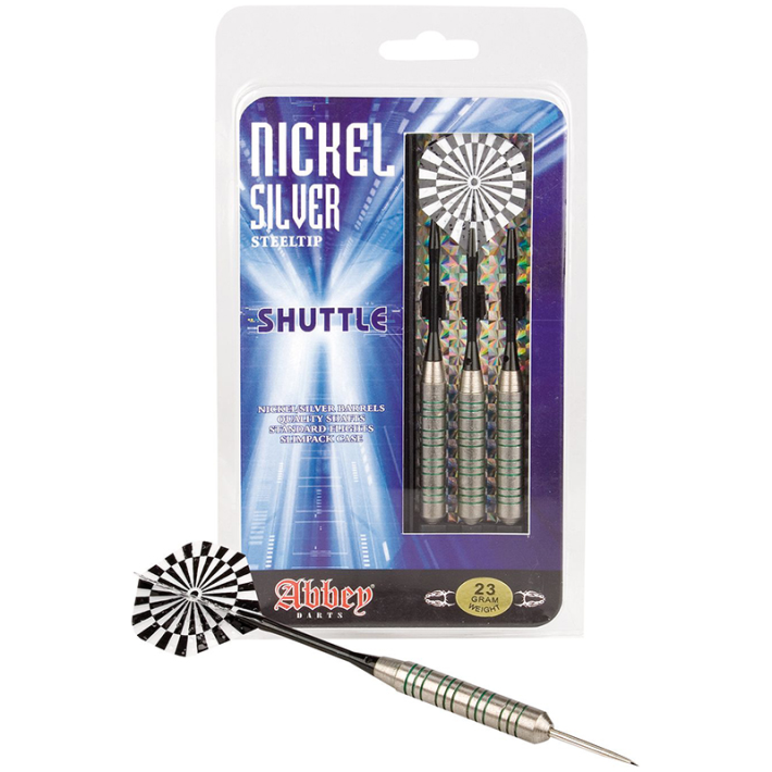 Nikkelirunko Teräskärki Alumiinivarsi 3D-pyrstöt Pakkaus sisältää 3 kpl valmiita tikkoja, varavarret ja muovikotelon.