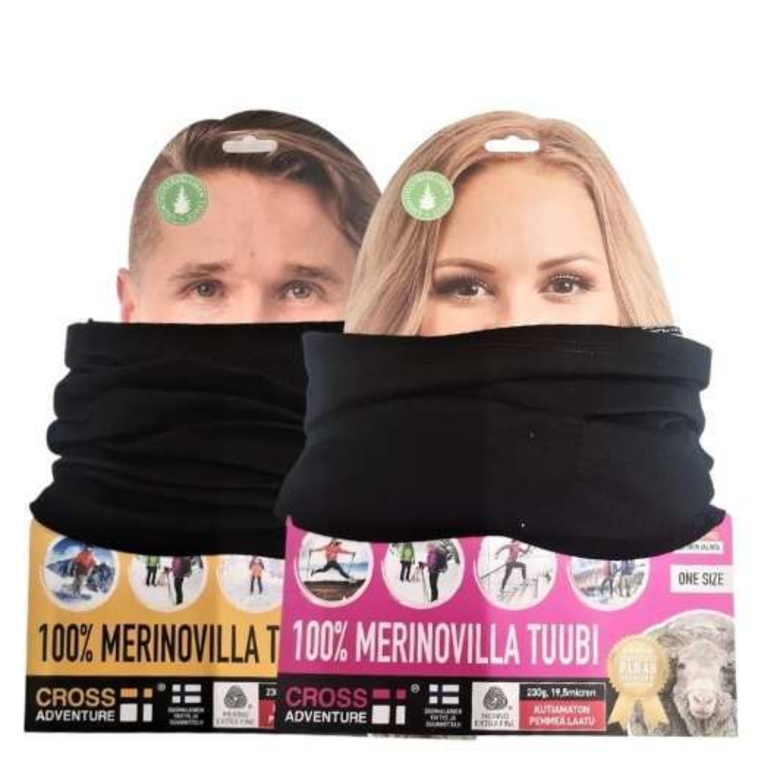 Cross Adventuren tuubi on 100% merinovillaa. Eikä vain merinovillaa, vaan sen sen parhainta ja pehmeintä laatua (Merino Extra Fine, 230g, 19,5micron), joka on kutiamaton, eikä hiosta, on kestävä ja lämmin. Parhain Interlock-kudontatekniikka viimeistelee tuotteen laadun ja mukavuuden. Tuubi suojaa erinomaisesti kaulan ja leuan. Se ei päästä kylmää takin sisään ja on erittäin mukavan tuntuinen päällä. Parasta laatua edulliseen hintaan. 100% merinovilla antaa parhaan suojan kylmää ja kosteutta vastaan.