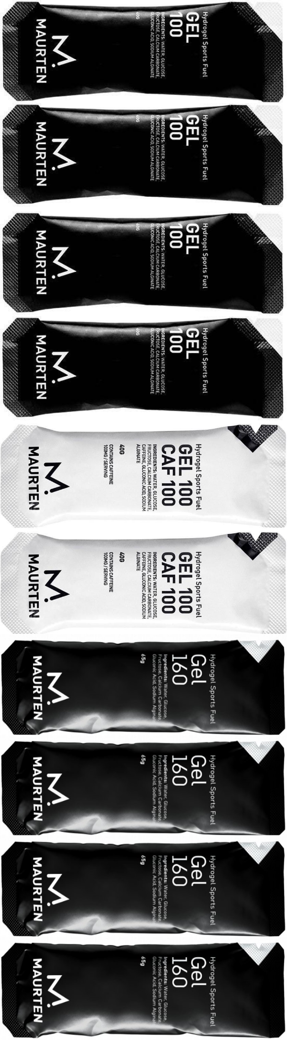 Maurten Gel Mix lajitelma sisältää Gel 100 40g x 4 kpl, Gel 100 Caf 40 g x 2 kpl ja Gel 160 65 g x 4 kpl.